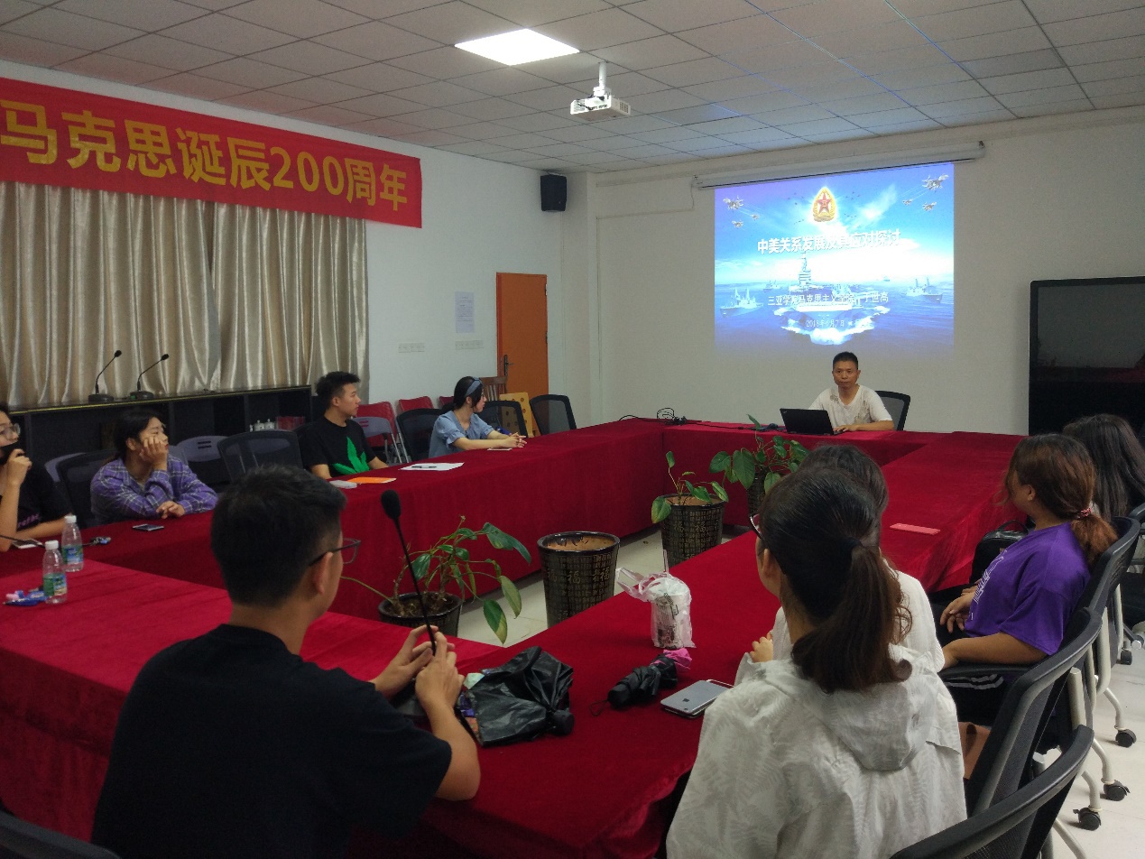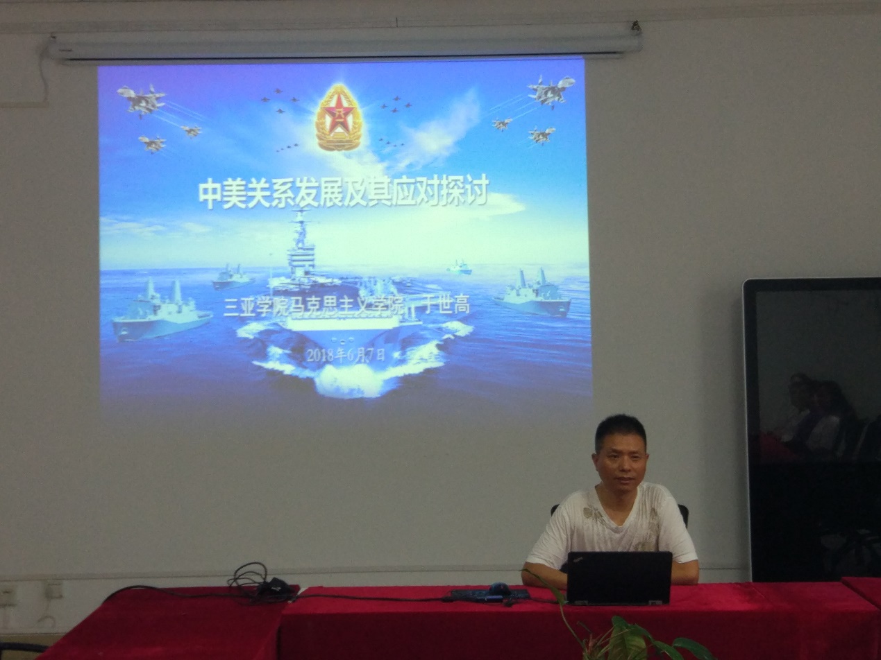 6月7日上午,在马克思主义学院二楼会议室,举行“中美关系发展及其应对探讨”学术讲座。讲座由我院教师于世高博士主讲,于世高博士简要回顾了中美关系的历史特点,认真分析了中美关系的现实表现,客观比较了我盛美衰的深层次原因,客观预测了中美关系的战略趋势,并就中美关系的未来发展趋势和我国应该采取什么样的措施,从大战略角度,与参与讲座的师生进行讨论和交流。