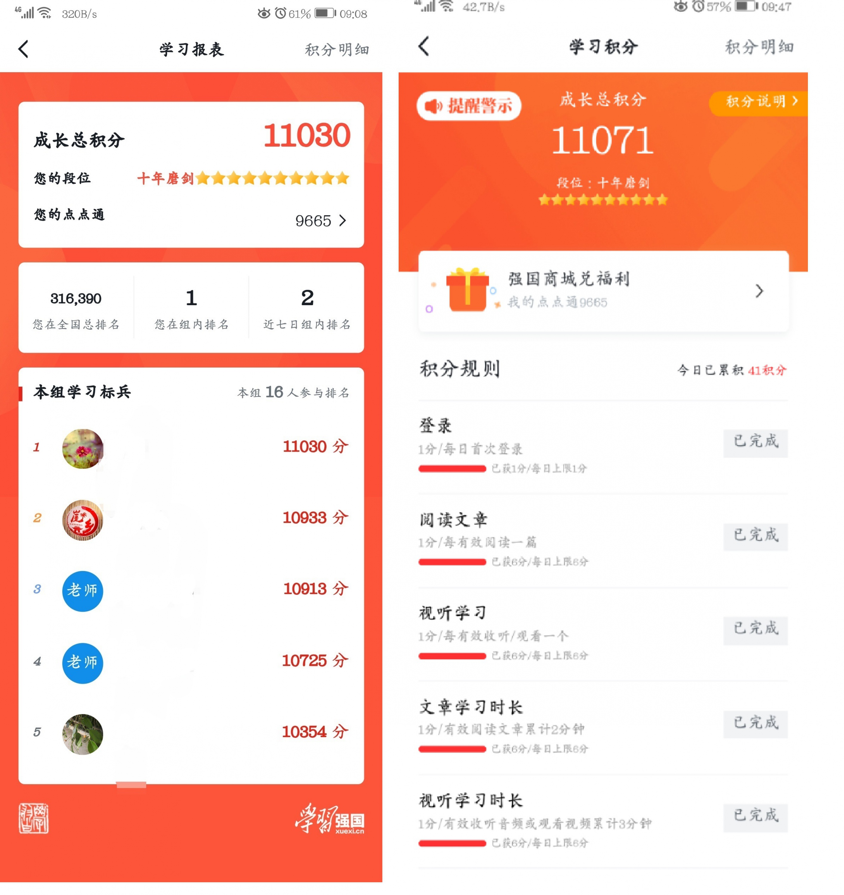马克思主义学院在“学习强国”学习伊始,就高标准、严落实,利用思政课教师自身专业优势,高效完成每天的学习任务。老教师由不熟练操作手机到应用自如、哺乳期的女教师忙完一天的教学工作和哄睡宝宝以后也要赶在截止时间之前做完每道题,学院的学习强国学习气氛浓郁、热潮高涨,有的老师保持了半年的每天零差错纪录。
