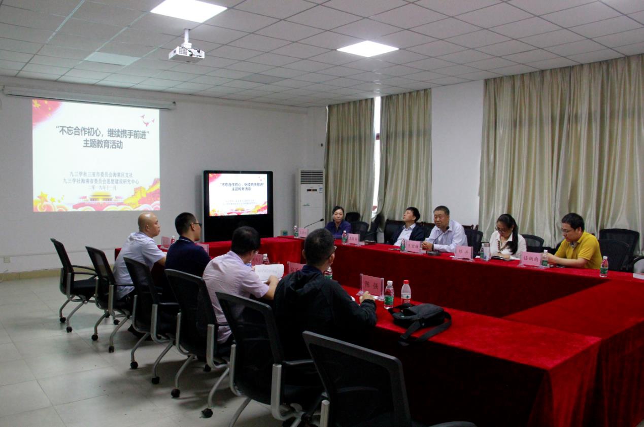最后,王宏海主任对九三学社海南省委员会思想建设研究中心、九三学社三亚市委员会海棠区支社在下一步开展“不忘合作初心,继续携手前进”主题教育活动提出四点要求:一、每一个社员要牢记使命,肩负时代担当,为社会贡献力量;二、要不断反思,进行自我批评,进一步提升自身修养;三、加强组织建设,严肃纪律,提高组织意识;四、要有清醒认识,有家国情怀,通过“共商国事”提升自身的服务水平。