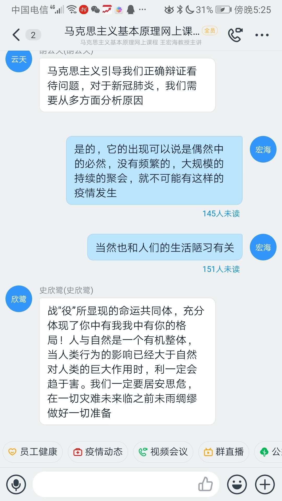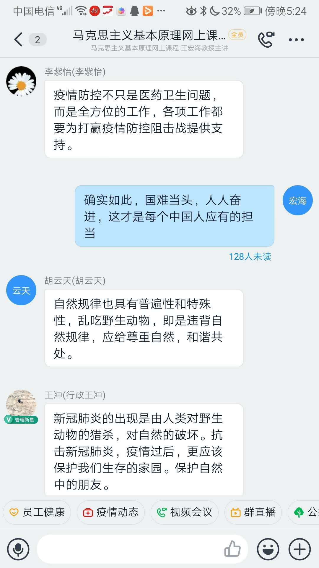 3月9日下午,马克思主义学院思政课教师组织全校大一大二的学生观看2.30-4.00的“全国大学生同上一堂疫情防控思政大课”的直播,直播结束后分两组进行线上讨论:一组是老师们组织的学生线上讨论,一组是无课的老师进行的线上讨论。