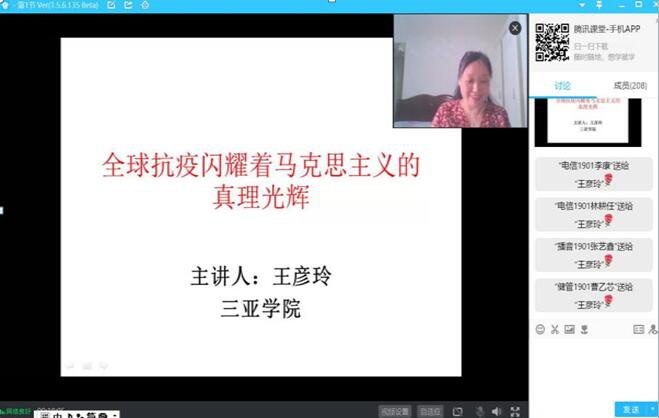 4月27日,马克思主义学院教授王彦玲在腾讯课堂直播平台,结合全球抗疫情况做了关于《全球抗疫闪耀着马克思主义的真理光辉》的讲座,358人通过线上参加此次讲座。此次讲座王老师讲了新冠病毒肺炎全球大流行,危及人类生命健康,人类要彻底摆脱危机,必须思考人与自然、人与人等深层次的问题,全球抗疫的点点滴滴都闪耀着马克思主义存在论、实践论、社会历史观的光辉。