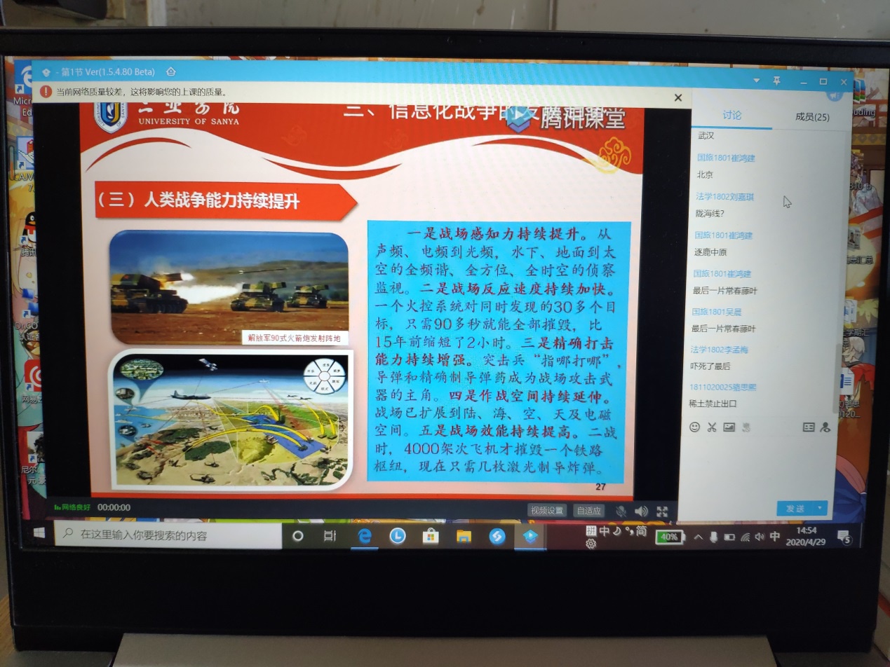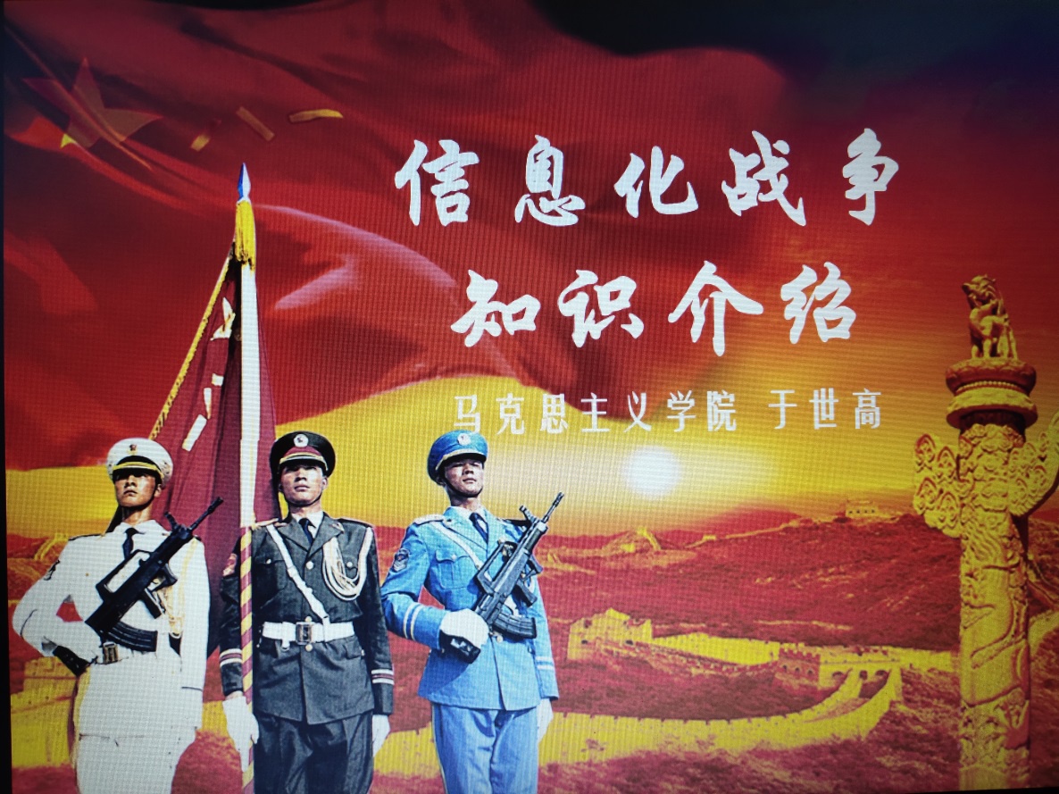 4月29日下午,在新冠肺炎依然肆虐全球的特殊教学背景下,我院教师于世高博士通过腾讯课堂这一特殊的网上授课方式,为2018级的军事爱好者,进行了一次题为“信息化战争知识介绍”的学术讲座。