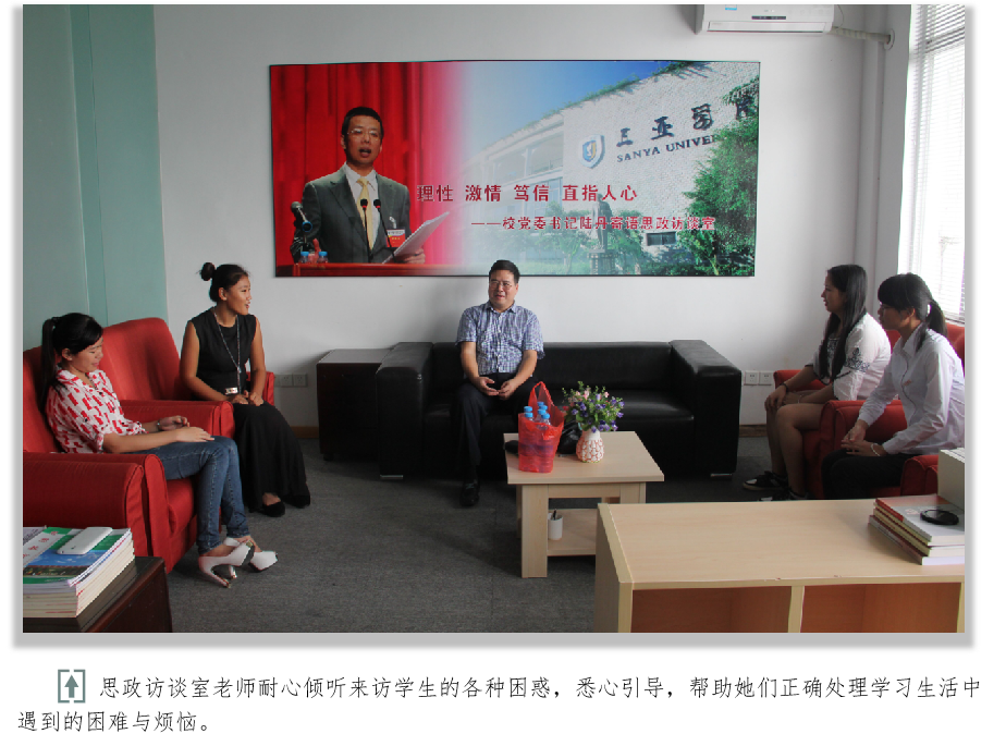 从2011年开始,马克思主义学院社科部直属党支部以培养理性政治人为目标,充分发挥思政访谈室“知识性与导向性、学术性与政治性、思辨性与趣味性相结合”的德育功能。访谈室紧紧围绕党和国家重大政策、国际国内重大事件、国计民生重大问题、学校发展和个人前途以及与学生思想政治工作有关的一切问题,与学生促膝谈心、答疑解惑,使学生在小人物大环境、小问题大道理、小事情大文章的情境设计中领悟更深刻的道理。在帮助学生解决理论与实践的差距、理想与现实的矛盾中建立融洽的人际关系,形成完善的心理防御机制。截至2020年春季学期以前,思政访谈室已成为三亚学院马克思主义学院最为靓丽的思政教育品牌活动之一,为三亚学院学生健康人格教育做出了突出贡献,充分实现了“用社会主义核心价值观塑造学生健康人格和政治理性”的最佳思政课实践教学效果。