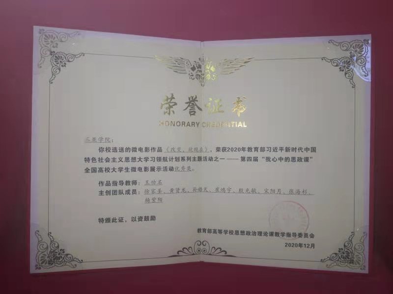 在日前结束的由教育部主办的习近平新时代中国特色社会主义思想大学习领航计划系列主题活动线上总结交流会上,马克思主义学院代表三亚学院报送的作品《改变,就现在》在全国289所高校的337部微电影作品中脱颖而出,获第四届“我心中的思政课”全国高校大学生微电影展示活动优秀奖。本次活动由教育部指导,教育部高校思政课教学指导委员会主办,武汉大学马克思主义学院承办,由各省、自治区、直辖市教育厅(教委)选报优秀作品参赛。