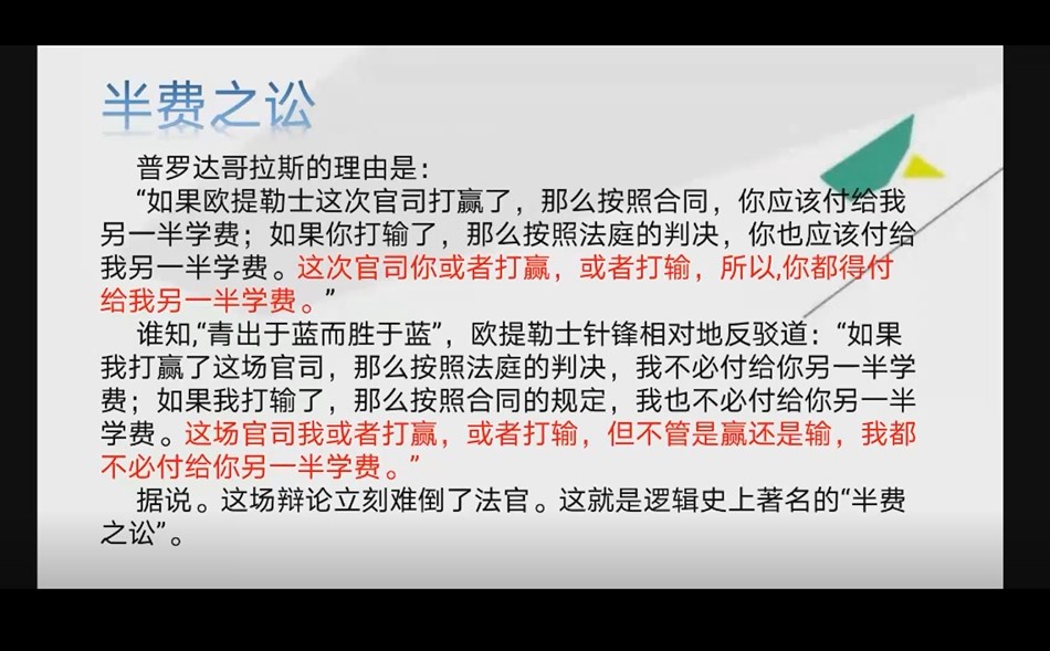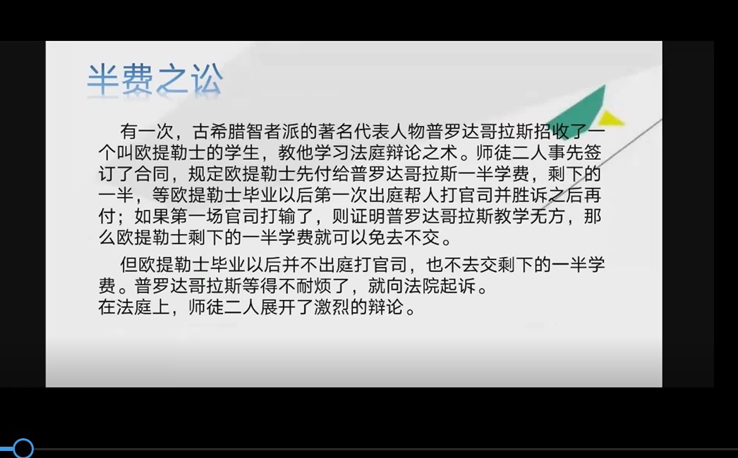 康锦江同学讲述了古希腊一个有名的案例“半费之讼”: