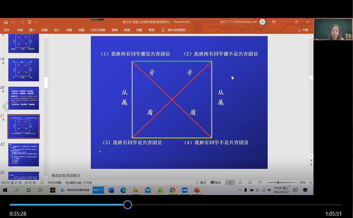 本次通识课的内容主要是亚里士多德的对当关系和三段论。教学内容一如既往地是案例教学,学生主要通过屏幕留言和我互动。看到他们不断在屏幕上留言,知道他们在用心学习。赵佳慧同学留言说:“下反对关系没理解。”我立刻举了这样的例子: