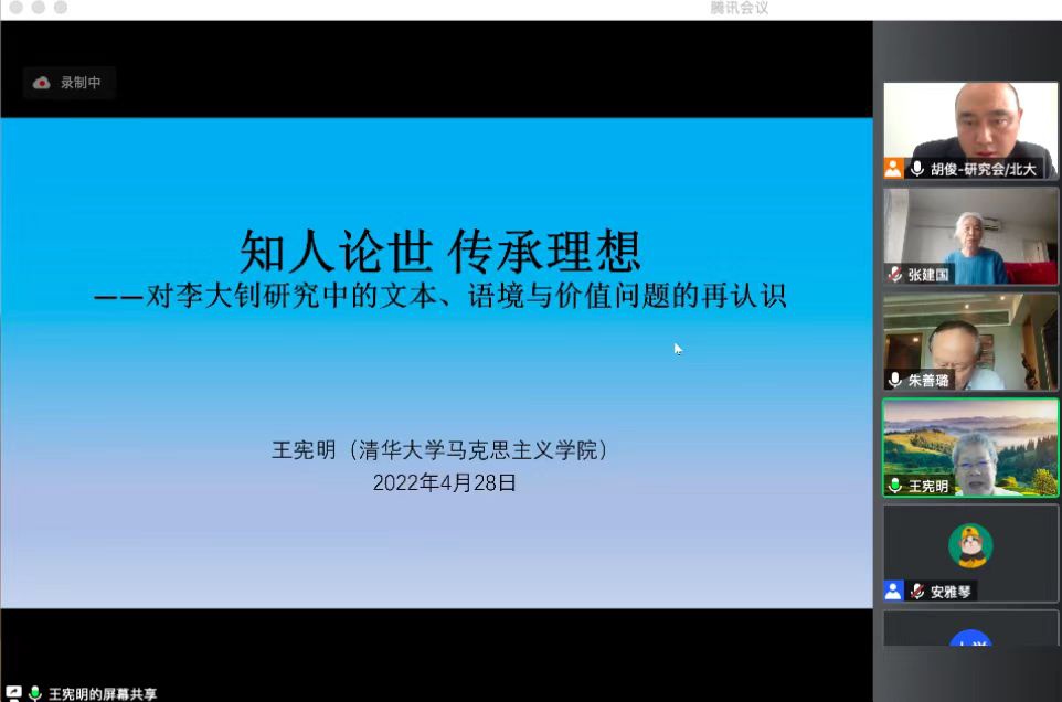 2022年4月28日是李大钊同志英勇就义95周年纪念日。中国李大钊研究会以在线方式举行“新起点的李大钊研究”研讨座谈会,李大钊同志之孙、原安徽省政协副主席、“七一勋章”获得者李宏塔,李大钊之孙女李乐群,中国李大钊研究会会长朱善璐,中共北京市委党校副校长袁吉富等和全国各地专家学者150余人以线上方式参会,侯且岸等十余名专家学者发言,朱善璐作总结讲话。中国李大钊研究会海南教研基地教师参加“新起点的李大钊研究”研讨座谈会。