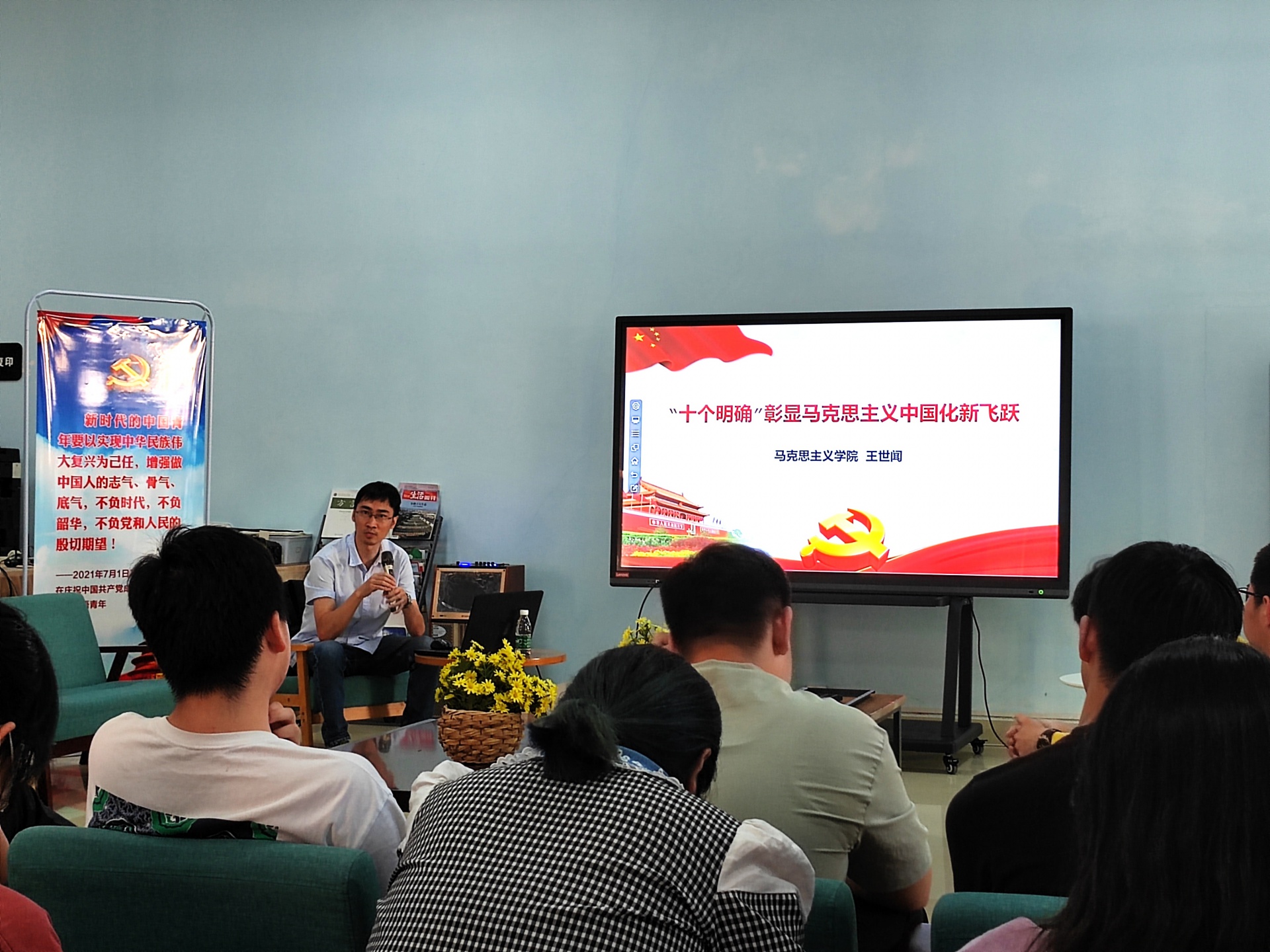 12月5日下午,天涯讲坛系列讲座在学生中心开讲。马克思主义学院教师王世闻围绕党的二十大精神,做题为“十个明确”彰显马克思主义中国化新飞跃的专题报告。