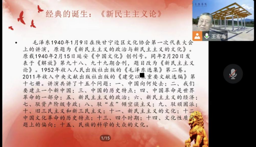 其次,王宏海教授又以《新民主主义论》与中国革命;《解放思想 实事求是 团结一致向前看》与改革开放讲了经典再造。从唯物史观解释红色经典源于广大人民群众的实践,人民群众实践促进经典的诞生。