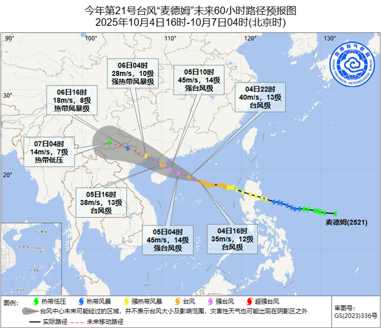 今年第21号台风“麦德姆”(台风级),4日16时其中心位于北纬18.4度、东经114.8度,也就是在距离海南省文昌市东南方向约420公里的南海海面上,中心附近最大风力12级(35米/秒),七级风圈半径300~400公里,十级风圈半径80~100公里,十二级风圈半径30公里。预计,“麦德姆”将以每小时25~30公里的速度向西偏北方向移动,并逐渐向海南岛东北部到广东西部一带沿海靠近,强度逐渐增强,最强可达强台风级(14~15级,42~48米/秒),将于5日上午在文昌登陆或近海擦过(强台风级,14~15级,42~48米/秒),登陆后强度逐渐减弱。