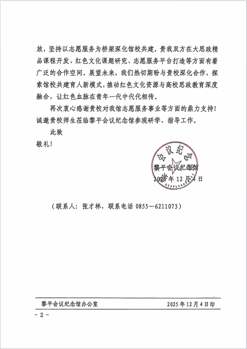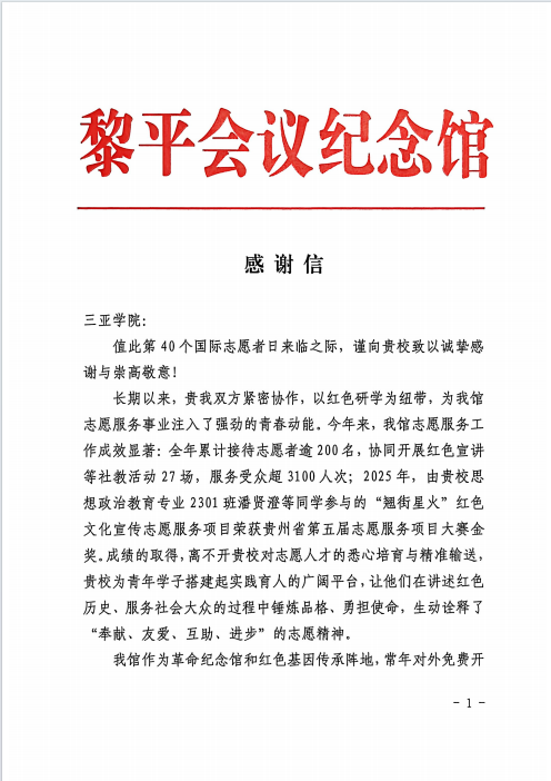 黎平会议纪念馆致三亚学院志愿者感谢信