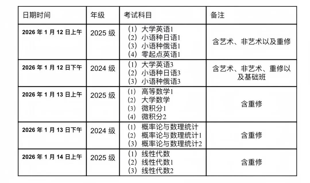 2.期末考试周:2026 年 1 月 12 日 - 1 月 23 日,全校集中进行期末考试,需提前确认考试时间和地点。