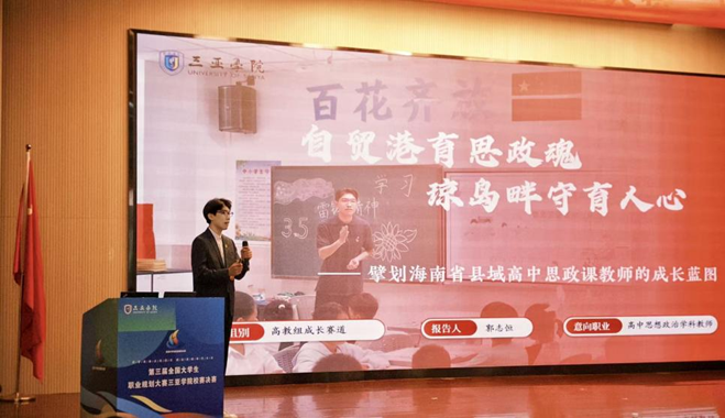 本次大赛以“筑梦青春志在四方,规划启航职引未来”为主题。自大赛启动以来,我院精心组织,得到了同学们的积极响应。决赛现场,郭志恒同学表现自信从容,逻辑清晰,目标明确,以《自贸港育思政魂 琼岛畔守育人心——描绘海南省县域高中思政课教师的成长轨迹》为主题,结合县域高中的发展机遇,彰显三亚学院“产教融合”的育人特色,系统阐述了个人职业目标。