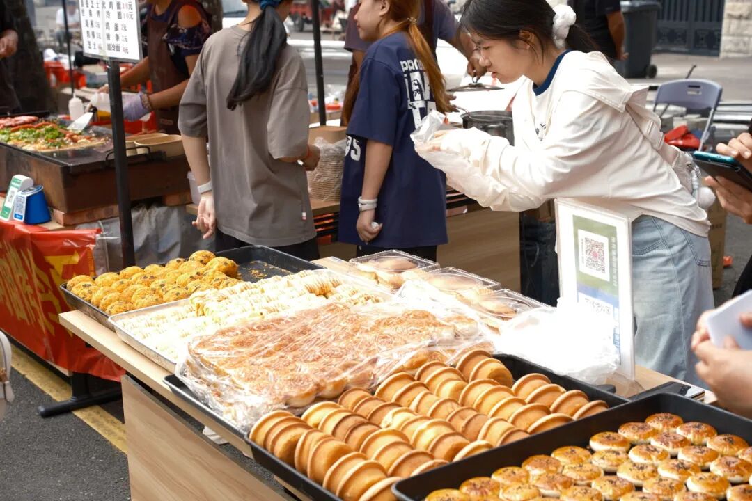 活动现场,三档美食摊位前人头攒动。烤冷面摊位上,滋滋作响的面饼裹着新鲜鸡蛋、脆爽蔬菜与香浓酱料,摊主娴熟翻面、快速卷制,热气中裹挟着咸香气息,瞬间勾起味蕾渴望。蛋糕摊位上,奶油细腻绵软,甜而不腻的口感收获师生一致好评,成为打卡分享的热门选择。糖炒栗子摊位前更是排起长队,饱满的栗子裹着焦香糖衣,剥壳后软糯香甜,暖手又暖心,是最治愈的滋味。解说员们热情分享:“烤冷面的街头烟火气、蛋糕的甜蜜仪式感、糖炒栗子的暖意,都是我们想带给大家的生活小美好。”