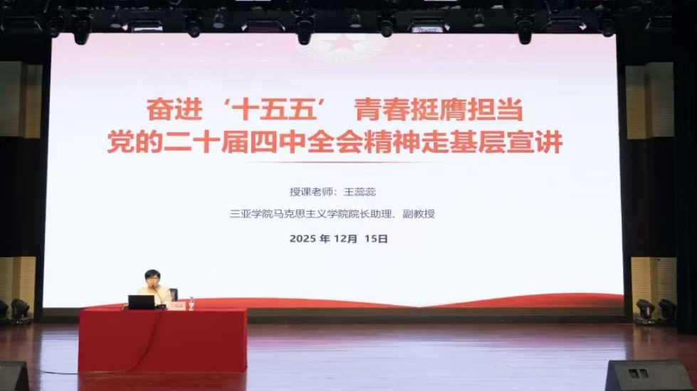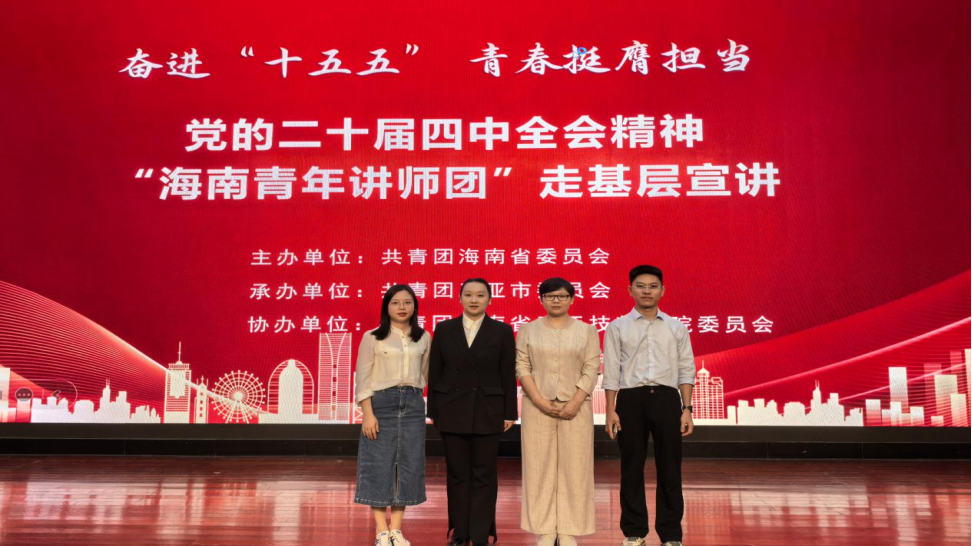 为深入学习贯彻党的二十届四中全会精神,引导广大团员青年把思想和行动统一到全会部署上来,凝聚奋进“十五五”的青春力量。近日,海南青年讲师团按照共青团海南省委统一部署,先后赴昌江黎族自治县、东方市、乐东黎族自治县、三亚市开展“奋进‘十五五’ 青春挺膺担当”主题走基层宣讲活动。宣讲活动紧扣基层实际,以青春视角解读全会精神,以务实举措回应群众关切,让党的创新理论在琼南大地落地生根、开花结果。我院院长助理王蕊蕊副教授作为团省委宣讲团成员受邀参加了本次走基层宣讲活动。