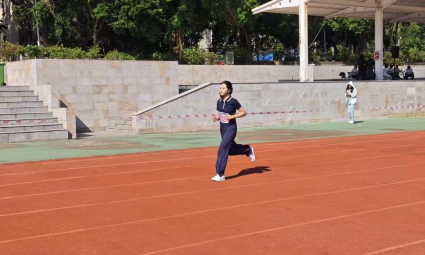 中距离赛跑是对意志与耐力的双重考验。在竞争尤为激烈的女子400米比赛中,彭淳同学表现突出。她合理分配体能,全程紧咬对手,在最后直道发起强力冲刺,凭借顽强的拼搏精神,最终勇夺第五名,为学院争得荣誉。