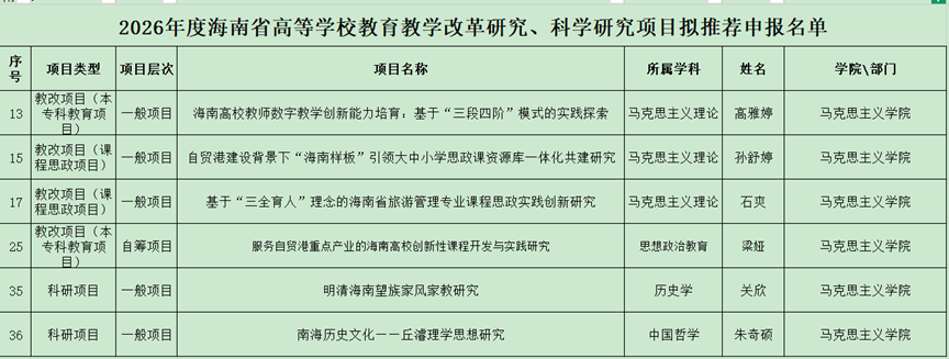 近日,学校公示2026年度海南省高等学校教育教学改革研究、科学研究项目拟推荐申报名单。其中,教育教学改革项目29项,科学研究项目25项,我院有6个项目获推荐申报,推荐立项数量再创历史新高。本次获推荐的项目涵盖教育教学改革研究和科学研究两大类别。在教育教学改革研究项目中,我院高雅婷、孙舒婷、石爽、梁娅四位教师申报的项目通过学校评审,获得推荐资格;科学研究项目方面,关欣、朱奇硕两位教师申报的项目成功入选推荐名单。我院本次获推荐的项目聚焦思政课教学创新、实践教学模式改革、马克思主义理论应用研究等多个方向,具有较强的创新性、应用价值和推广前景,充分彰显了学院深厚的教研积淀与蓬勃的学术活力。