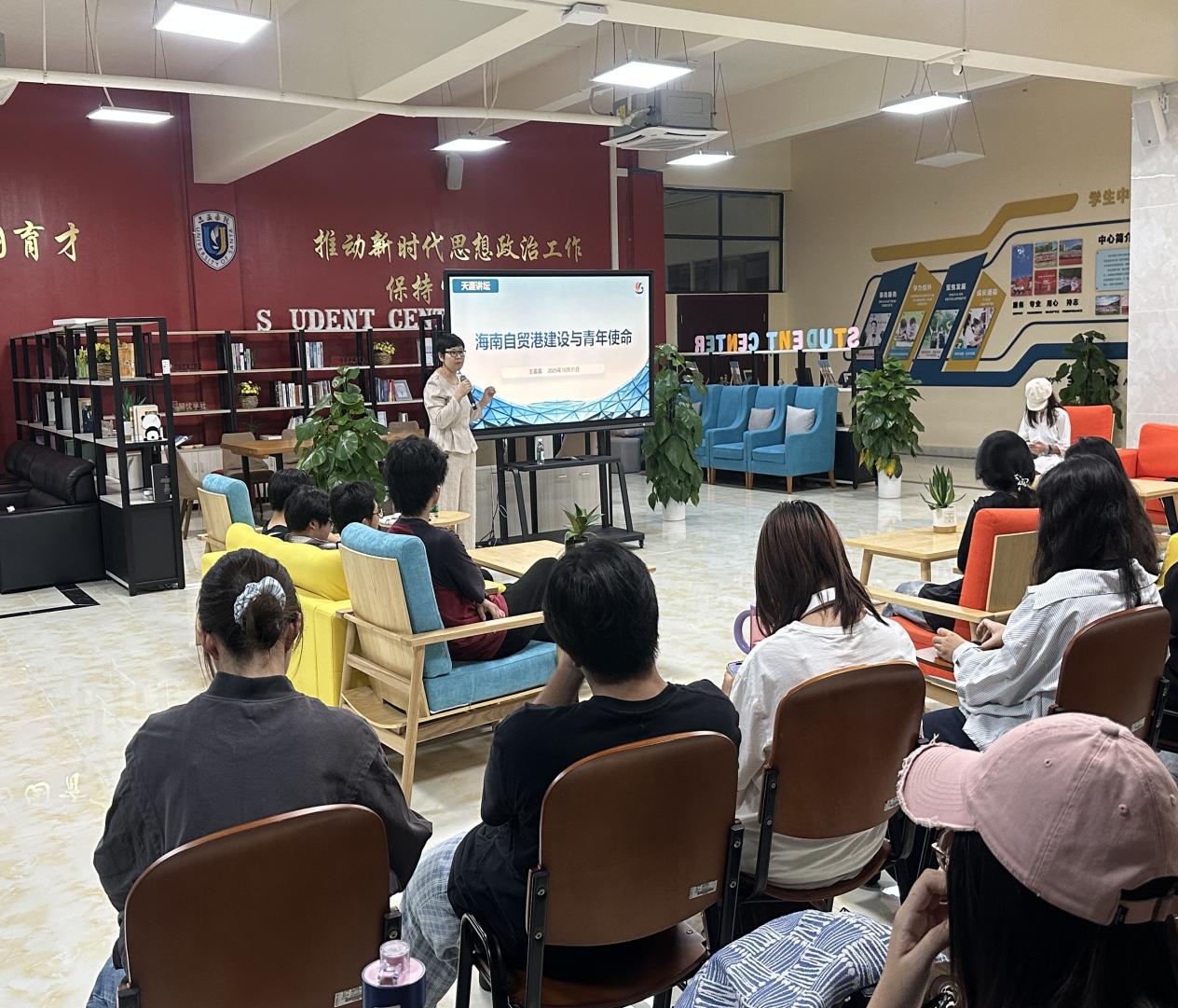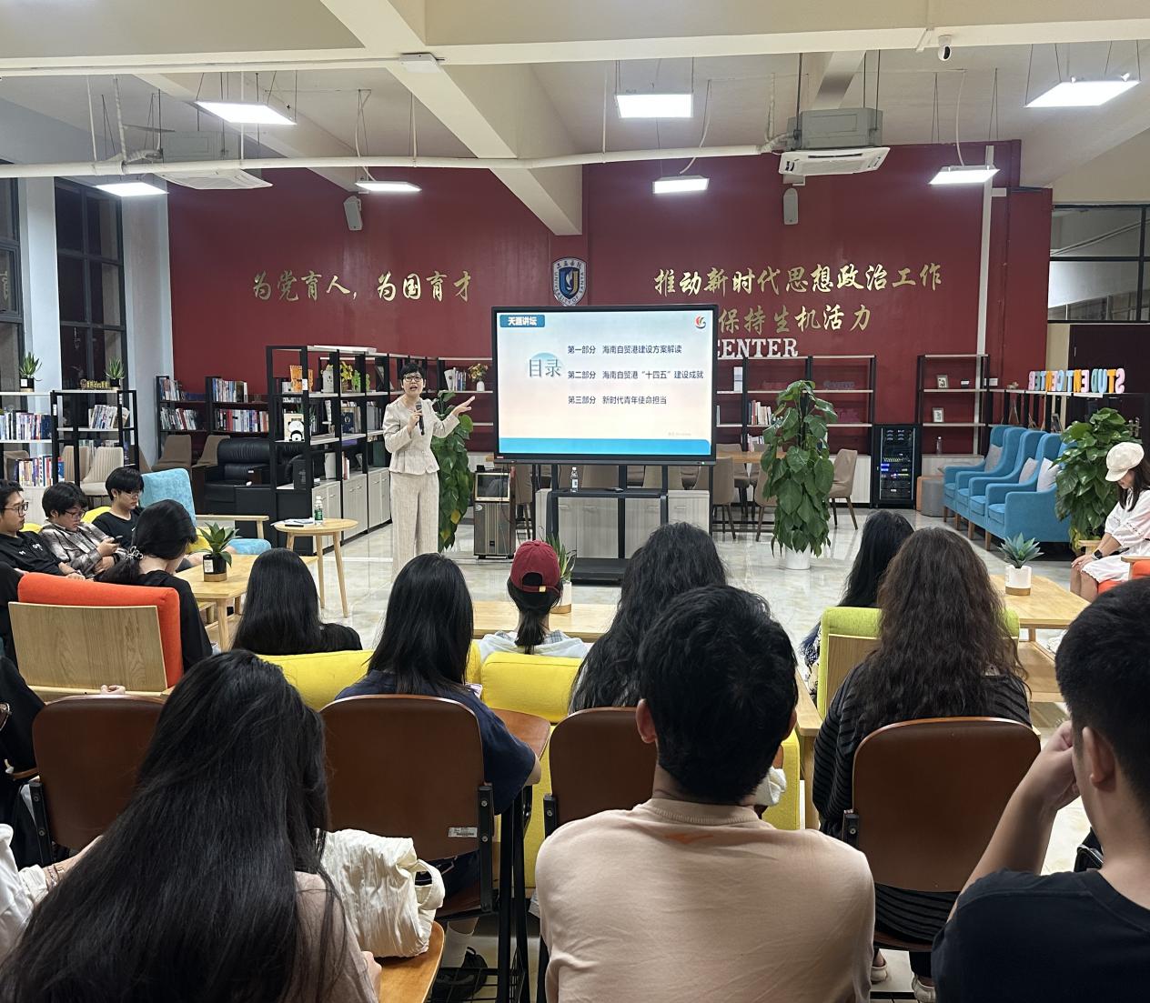 “封关运作不是‘政策终点’,而是青年参与自贸港建设的起点”。在“青年机遇”板块,王蕊蕊副教授的讲解引发全场共鸣。她结合省委书记冯飞对青年“刻苦钻研增长才干、踊跃投身自贸港建设”的殷切期望,为不同专业学生梳理出清晰的发展方向:法学专业可聚焦跨境法律实务、国际商事纠纷解决,汉语专业可参与本土文化 IP 打造、国际人文交流文案创作,思政专业则可深耕政策宣讲、基层治理研究,“每个专业都能在自贸港建设中找到专属赛道,希望同学们把专业学习与海南发展需求结合,让知识真正‘用得上、接地气’”。