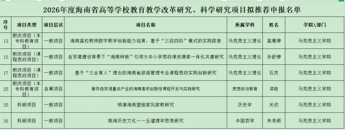 在2026年度海南省高等学校教育教学改革研究、科学研究项目拟推荐申报评选中,我院6项项目成功获得学校推荐,推荐立项数量再创历史新高。其中,教育教学改革项目4项、科学研究项目2项,涵盖高雅婷、孙舒婷、石爽、梁娅、关欣、朱奇硕等多位教师主持的课题,聚焦思政课教学创新、实践教学模式改革、马克思主义理论应用研究、海南旅游管理课程思政创新、地方历史文化研究等方向,课题兼具创新性、应用价值与推广前景。