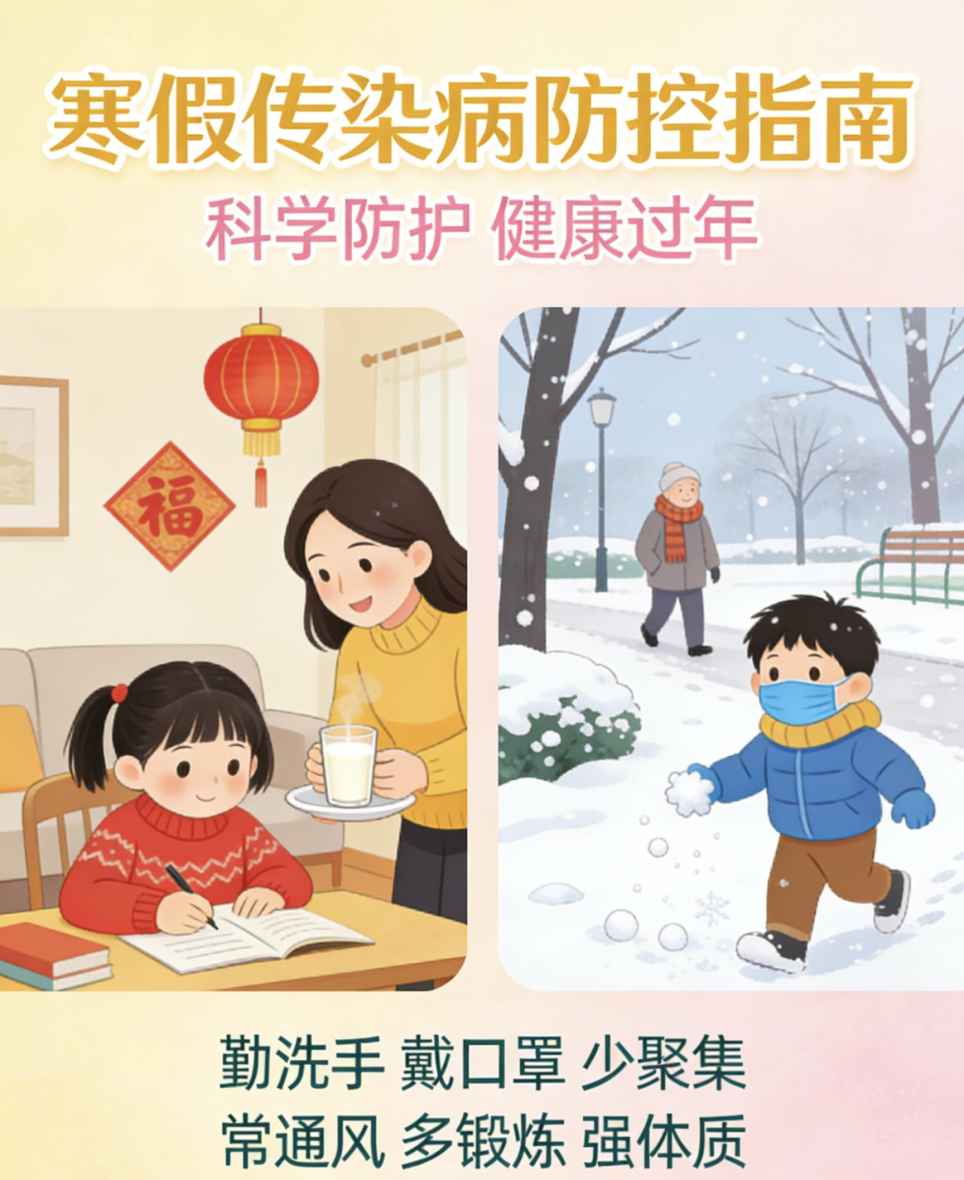 寒假期间,人员流动加大、亲友聚会增多,是呼吸道和消化道传染病易发高发期。为切实保障同学们的身体健康和生命安全,度过一个平安、健康、文明的假期,特此向全体同学发出温馨提示。