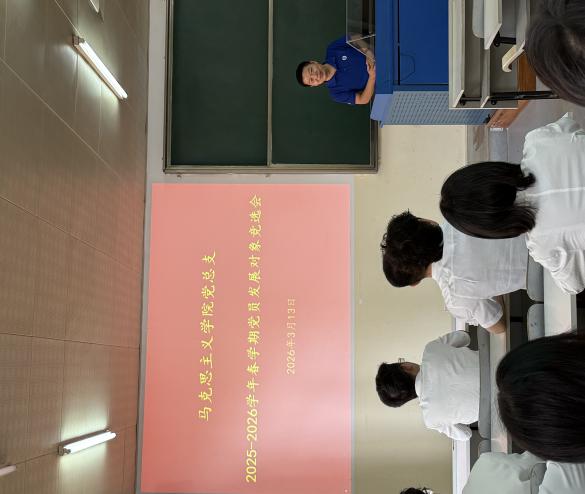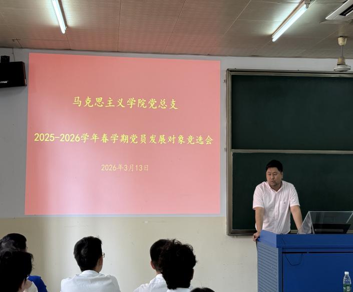 为严格落实党员发展工作要求,切实保证新发展党员质量,2026年3月13日,马克思主义学院2025-2026年春学期党员发展对象竞选会在明B102教室顺利召开。参加本次会议的有学院党总支副书记滕文庆老师、团委书记张肖老师、全体积极分子、预备党员以及六位竞选同学参加会议。
